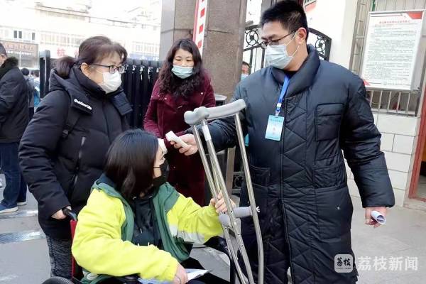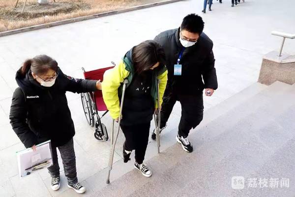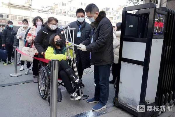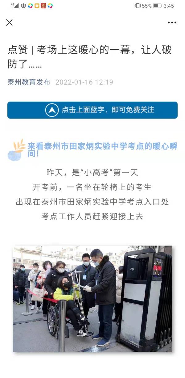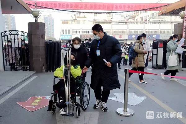 1月15日是“小高考”第一天,开考前,一名坐在轮椅上的考生出现在泰州市田家炳实验中学考点入口处,考点工作人员赶紧迎接上去。“你就是实验中学的xxx同学吧,请跟我来。”教务处副主任季红强一手助推着轮椅,一手引导着让这名考生迅速进入学校专门开辟的绿色通道。