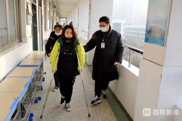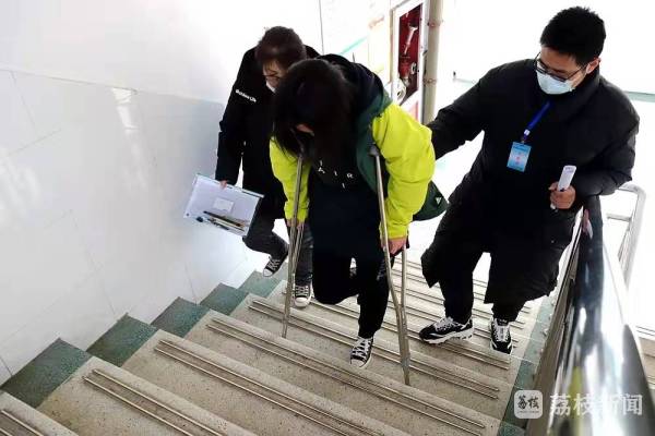 这名考生因为骨折尚未痊愈,不能行走。考前,接泰州市教育局相关部门通知,学校专门制定了特殊考生参加考试保障方案,开辟快速绿色通道,为考生提供必要的服务保障,帮助困难考生稳妥进入考场,确保考生顺利考试。
