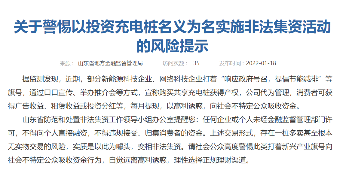 荔枝新闻讯 1月18日,山东省地方金融监督管理局网站发布“关于警惕以投资充电桩名义为名实施非法集资活动的风险提示”。