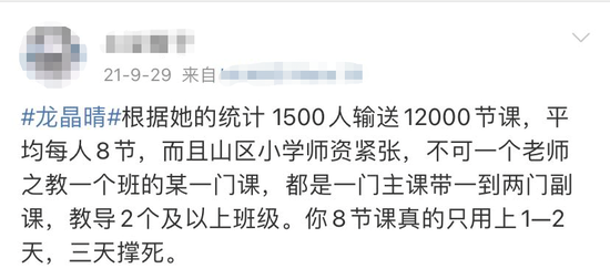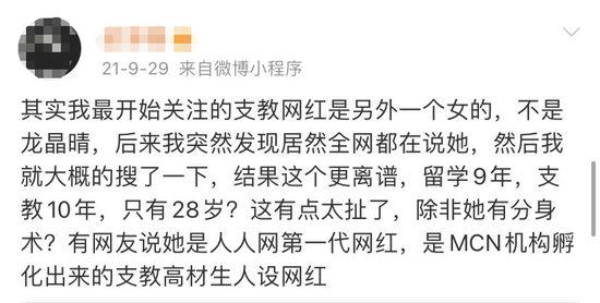 有博主发文质疑称,龙晶睛在短视频平台发布的支教日记有“违和感”,看完视频“不知道她在支教期间干了些什么,也不知道小朋友们到底学到了什么,只记得她武装到牙齿和头发丝的美丽形象”,质疑其“十年支教”的经历是“网红打卡式的持续作秀”。