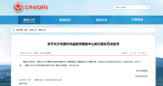 长沙市民政局网站消息,近日,根据公民举报,长沙市民政局对长沙市善吟共益助学服务中心涉嫌违规公开募捐进行了调查处理,并依法下达行政处罚决定书(长民罚决字〔2021〕1号),根据《中华人民共和国行政许可法》第四十条规定,向社会公开。