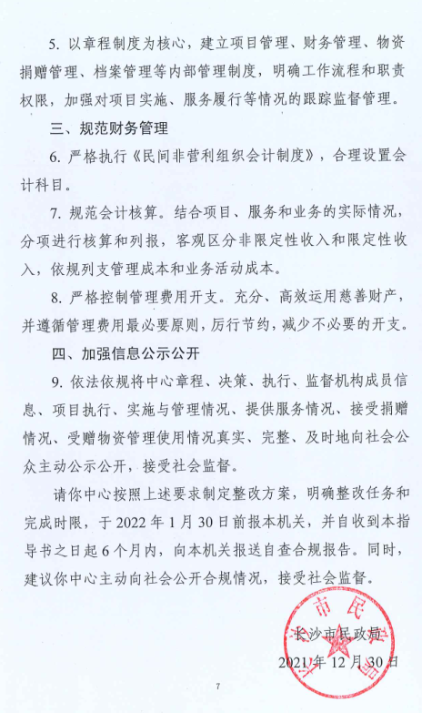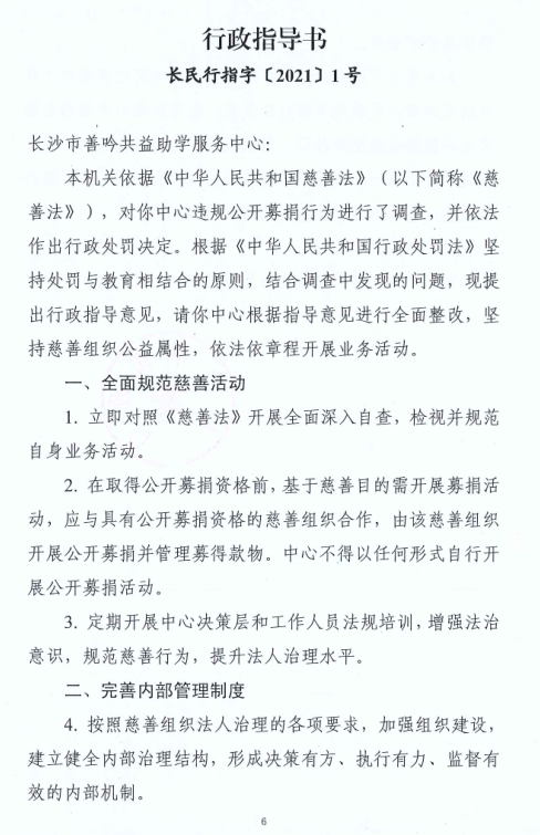 3.向当事人提出行政指导意见,要求当事人全面整改,依法规范慈善活动,完善内部管理制度,规范财务管理,加强信息公示公开。