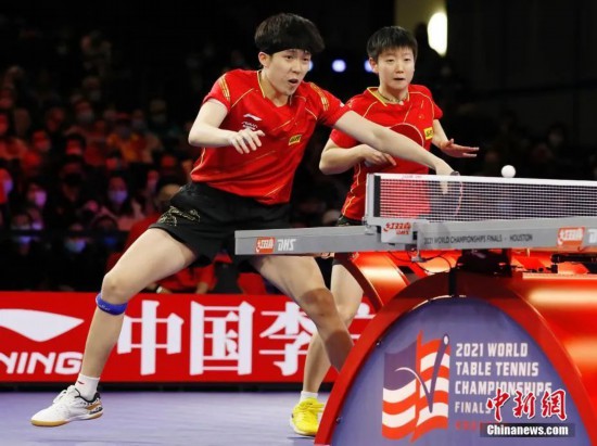 在美国休斯敦举行的2021世界乒乓球锦标赛混合双打决赛中,中国组合王楚钦/孙颖莎战胜日本组合张本智和/早田希娜,夺得冠军。中新社记者 刘关关 摄