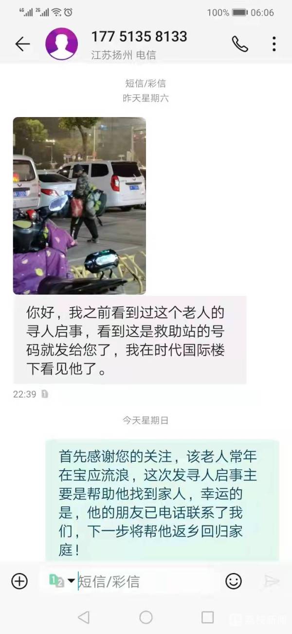 宝应县射阳湖镇网格员看到群消息后,将寻人信息转发到了各村组网格群。寻人启事发出去不到5小时,就有老人的熟人认出了老人是射阳湖镇人,并将线索提供给了网格员。得到线索后,射阳湖镇网格员立即反馈给了县救助站。经了解,这名老人叫张某德,60岁,家住射阳湖镇天平集镇某村。得知这个情况后,县救助站工作人员通过工作,了解到老人的子女情况,最终与已在外地工作生活的其女儿张某取得联系。张某称老人年龄大了,疑似患有精神疾病,已出走好多年,家人之前将老人接回去过,没几天又跑丢了,这些年家人多方寻找未果。接到县救助站工作人员电话后,张某终于得知老人的下落,情绪十分激动,即有对父亲饱含深深的爱,也有很多的辛酸和无奈,家人并表示尽快安排家人将老人送到医疗机构进行诊断治疗。至此,一场由网格员参与的寻人“接力赛”圆满落幕,走失老人顺利“回家”。