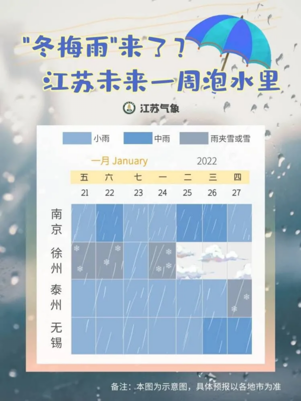 根据江苏省气象台预报,江苏将从21日夜里开始拉开雨雪天气的序幕,一直持续至28到29日。七八天的时间里都见不着太阳,市民要抓紧时机晾晒。
