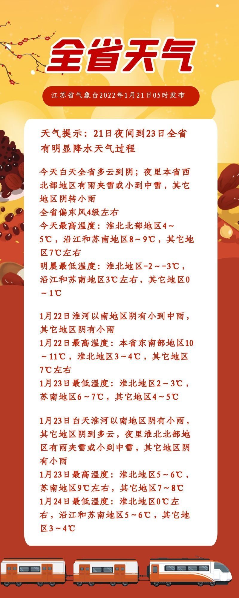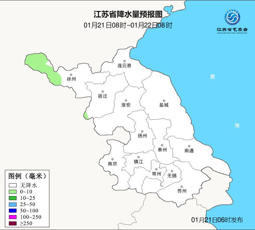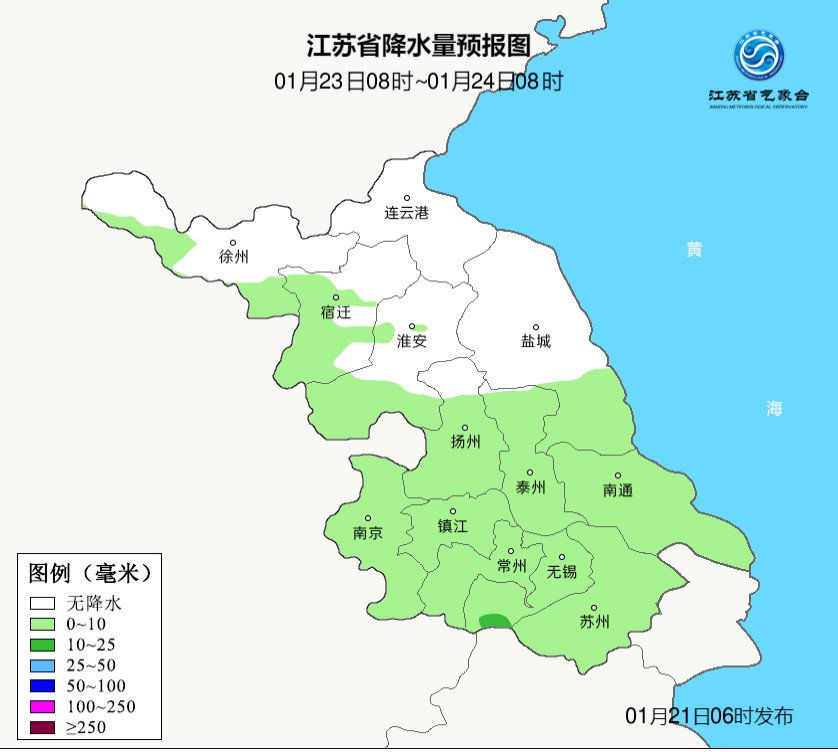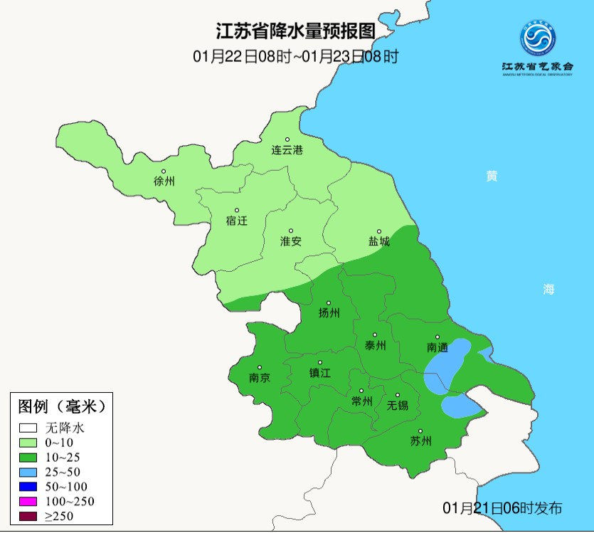 江苏省气象台首席预报员韩桂荣说:“21日夜里,江苏的西北部可能出现雨夹雪或者小到中雪,其他地方是小雨。22日,江苏以降雨为主。23日、24日、25日,淮河以南基本上小到中雨,淮北可能出现小雨夹雪或者小雪。”