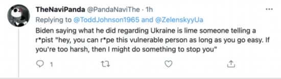另一名网友则认为拜登的言论实在不妥,“拜登在乌克兰问题上的所作所为就像对一名强奸犯说:‘嘿,你可以强奸这个脆弱的人,只要你做的不太过分。如果你太苛刻,我可能会做些什么来阻止你。’” ↓