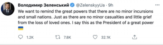 泽连斯基20日发推称,“我想提醒一些大国,不存在任何小规模入侵和小国家。就像不存在因失去至亲而造成的轻微伤亡和轻微悲痛一样。我是作为一个大国(乌克兰)的总统这么说的。” ↓