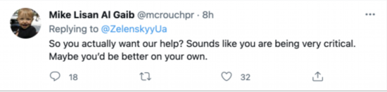 泽连斯基是在“挖苦”拜登——RT说。推文一经发布便引发议论,一名美国网友对泽连斯基的言论表示不满:“所以你真的需要我们的帮助?听起来你好像很挑剔。也许你们自力更生会更好。” ↓
