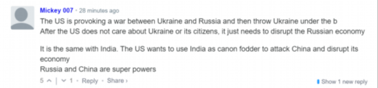 “美国在乌克兰和俄罗斯之间挑起一场战争,然后把乌克兰扔到一边。美国并不关心乌克兰或其公民,它只需要扰乱俄罗斯经济。(他们对待)印度也是如此。美国想利用印度作为攻击中国和扰乱中国经济的炮灰。俄罗斯和中国是超级大国。”