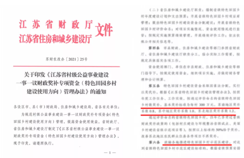 研究制定《江苏省村级公益事业建设一事一议财政奖补专项资金(特色田园乡村建设使用方向)管理办法》,明确面上创建阶段资金奖补范围、标准等内容,并支持各地推进特色田园乡村示范区建设。