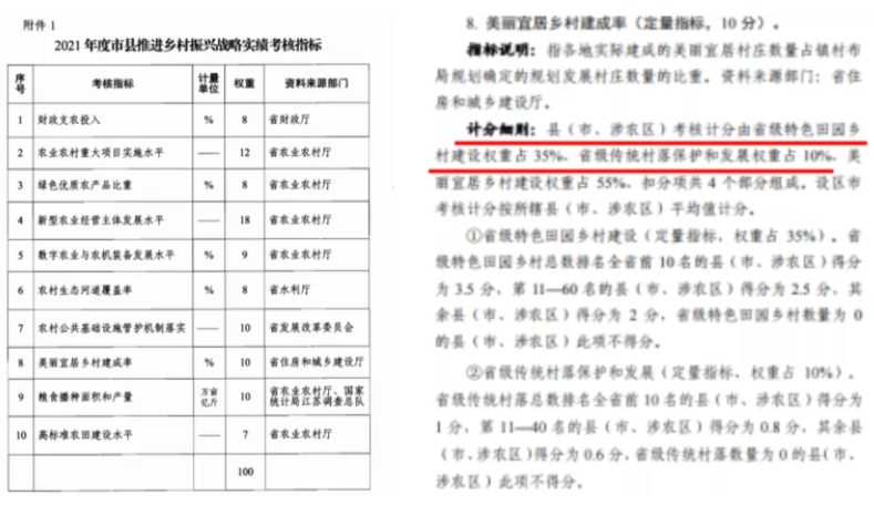 优化完善2021年度市县推进乡村振兴战略实绩考核指标体系,首次在“美丽宜居乡村建成率”指标中明确特色田园乡村建设、传统村落保护权重。“乡村振兴实绩水平”纳入2021年度全省高质量发展绩效评价考核指标,充分发挥了考核“指挥棒”作用。