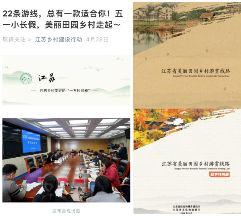 优选部分省级特色田园乡村和传统村落,与周边旅游资源串联形成22条、26条美丽田园乡村游赏线路,分别于2021年“五一”“十一”黄金周期间发布,并召开新闻发布会予以宣传推介,游线涉及村庄游客量明显增长。