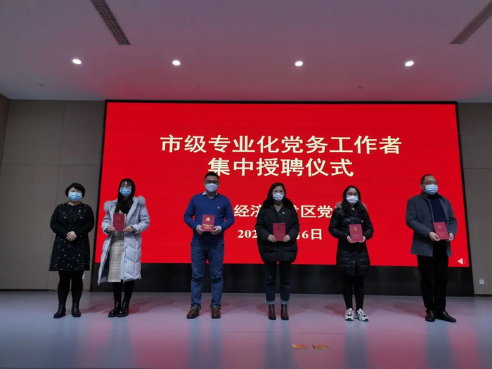 党支部的成立,为企业的高质量发展注入“红色生产力”。大会向2021年度开发区新成立的8家党组织进行集中授牌,江苏德宁建设工程咨询有限公司党支部书记丁海燕作表态发言。随后举行的市级专业化党务工作者集中授聘仪式上,党务工作者获颁专业资格证书。