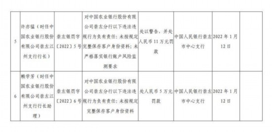 时任中国农业银行崇左江州支行行长助理赖学芳,对该行未按规定完整保存客户身份资料负有责任,被处人民币5万元罚款。