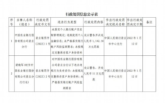 公示表显示,农业银行崇左分行存在的违法行为包括:因存在未落实个人银行账户实名制管理规定、违规使用个人金融信息、未严格落实银行账户风险监测要求、未按规定完整保存客户身份资料。对此,人民银行崇左市中心支行对农业银行崇左分行作出处以警告并共处人民币1142.50万元罚款的决定。