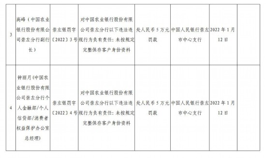 中国农业银行崇左分行个人金融部/个人信贷部/消费者权益保护办公室总经理钟丽月,对该行未按规定完整保存客户身份资料负有责任,被处人民币5万元罚款。