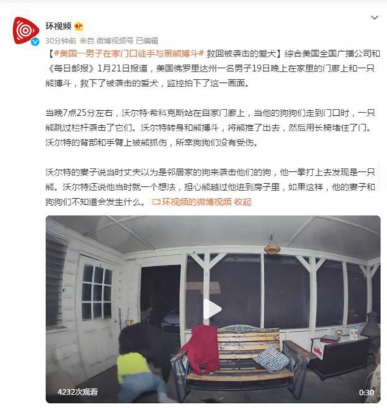 综合美国全国广播公司和《每日邮报》1月21日报道,美国佛罗里达州一名男子19日晚上在家里的门廊上和一只熊搏斗,救下了被袭击的爱犬,监控拍下了这一画面。