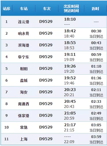 D9529次列车(动车 有空调),始发站:连云港;终到站:上海;全程共有11个停靠站: