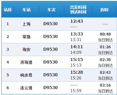 D9530次列车(动车 有空调),始发站:上海;终到站:连云港;全程共有6个停靠站: