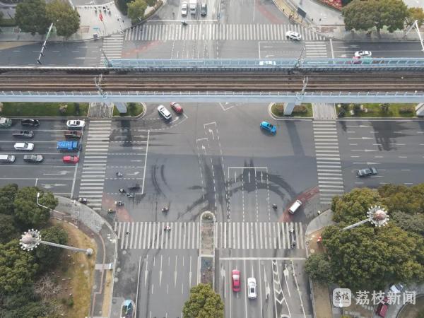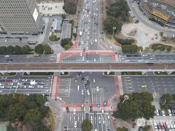 新春将至!南京江宁天元东路天印大道路口的四个方向斑马线也换了新样貌:由往日单调的黑白色色变成了醒目的红白色。