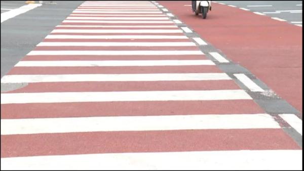 当然,变化的不只是颜色。与传统斑马线相比,这种红色斑马线的表面较为粗糙,采用了防滑颗粒材料,用以提高车辆的制动和摩擦力。