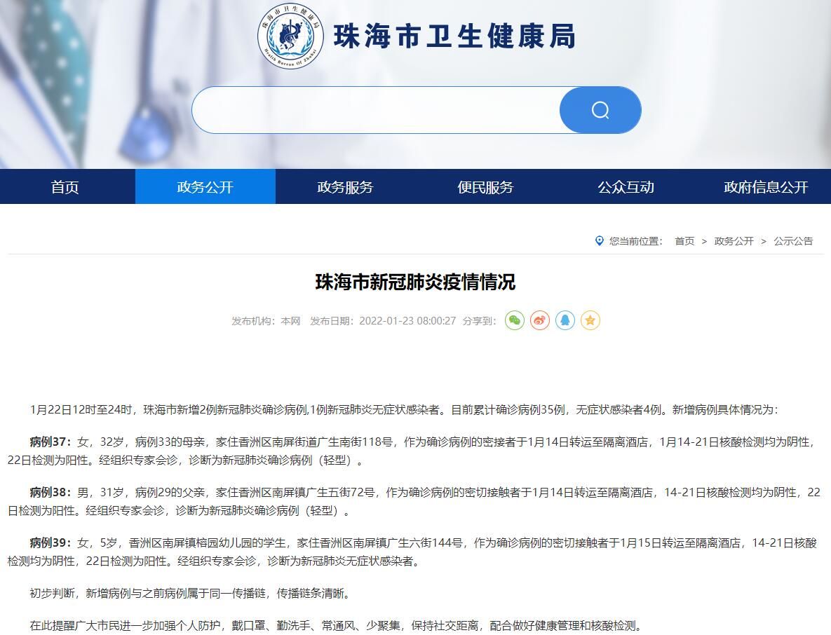 病例37:女,32岁,病例33的母亲,家住香洲区南屏街道广生南街118号,作为确诊病例的密接者于1月14日转运至隔离酒店,1月14—21日核酸检测均为阴性,22日检测为阳性。经组织专家会诊,诊断为新冠肺炎确诊病例(轻型)。