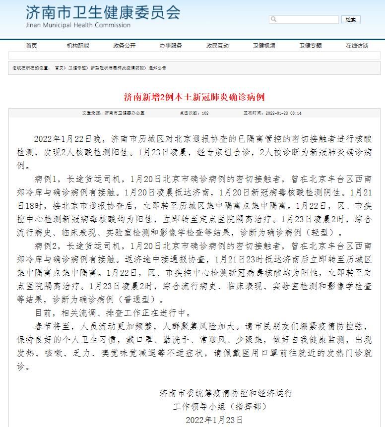 荔枝新闻讯 据济南市卫健委网站消息,2022年1月22日晚,济南市历城区报告2名已隔离管控人员新冠病毒核酸检测阳性。1月23日凌晨,经专家组会诊,2人被诊断为新冠肺炎确诊病例。
