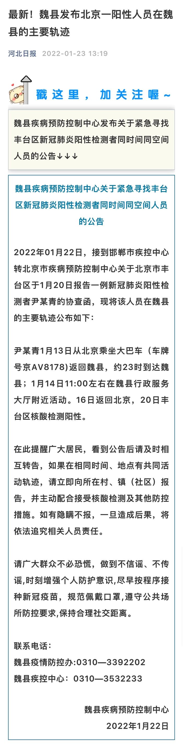 2022年01月22日,接到邯郸市疾控中心转北京市疾病预防控制中心关于北京市丰台区于1月20日报告一例新冠肺炎阳性检测者尹某青的协查函,现将该人员在魏县的主要轨迹公布如下: