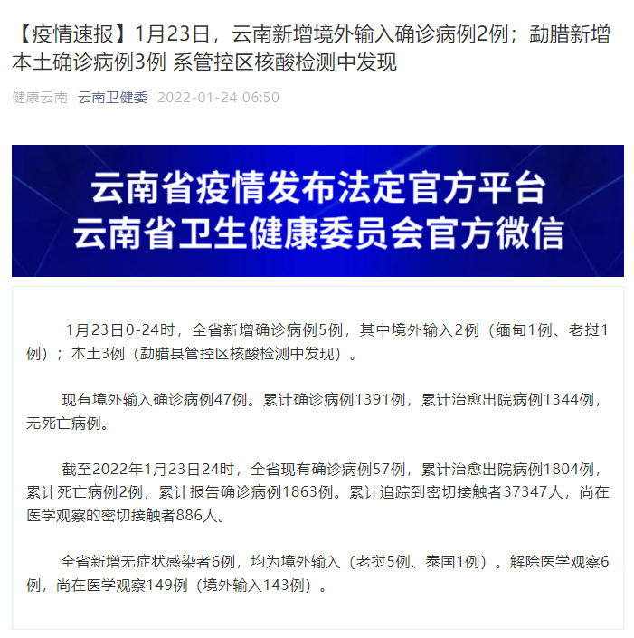 据健康云南微信公众号消息,1月23日0-24时,全省新增确诊病例5例,其中境外输入2例(缅甸1例、老挝1例);本土3例(勐腊县管控区核酸检测中发现)。