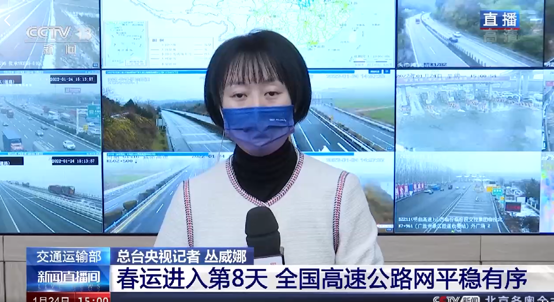 总台央视记者 丛威娜:今天是春运的第8天了,全国公路网运行平稳有序。昨天全国共发送旅客2596万人次。今天受降雪影响,目前河北、河南、山西境内,一共有8条高速的9个路段处于封闭状态,恢复通行时间待定,毕竟现在是春运期间,出行安全是第一位的。全国公路气象预报显示,截至今晚8点,全国中部地区有小雪和中雪,南部地区是小到中雨的天气。随着冬奥会临近,目前北京、河北境内的4条涉奥高速公路的通行量,今天总计达到了28.05万辆,高速公路通行状况良好。最后提示大家,在自驾车出行返乡途中,关注实时路况,安全防疫第一。