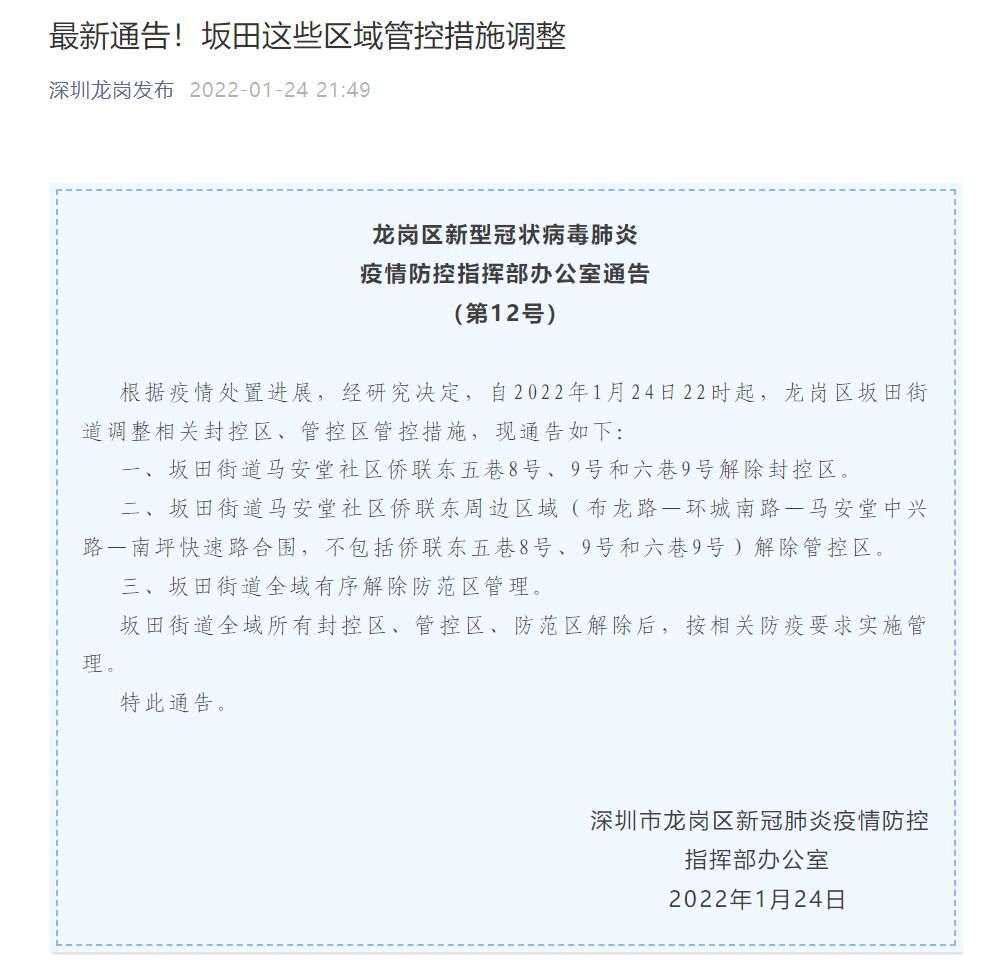 荔枝新闻讯 深圳龙岗区新型冠状病毒肺炎疫情防控指挥部办公室发布通告称,根据疫情处置进展,经研究决定,自2022年1月24日22时起,龙岗区坂田街道调整相关封控区、管控区管控措施,现通告如下: