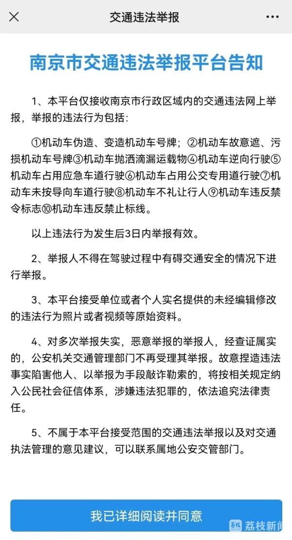 目前,南京交通违法微信举报平台接受以上十类交通违法行为举报。对于不属于本平台接受范围内的交通违法举报,市民可以联系属地公安交管部门提供线索进行查处。