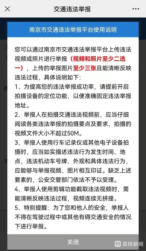 此次升级后,市民可直接通过“南京公安”“南京交警”微信公众号上的交通违法举报功能,在违法行为发生后3日内,均可提交视频、照片等违法线索。