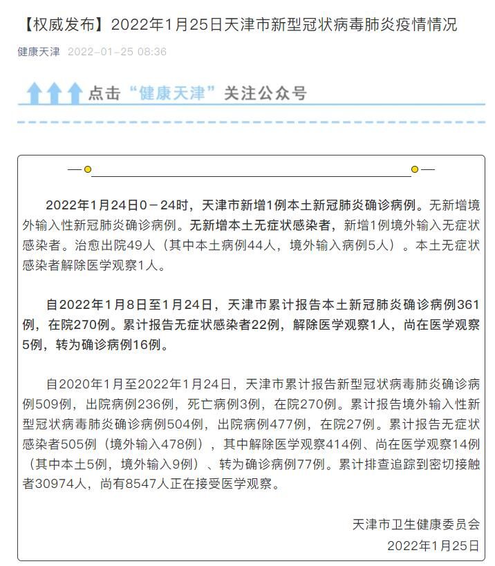 荔枝新闻讯 据“健康天津”微信公众号消息,2022年1月24日0-24时,天津市新增1例本土新冠肺炎确诊病例。无新增境外输入性新冠肺炎确诊病例。无新增本土无症状感染者,新增1例境外输入无症状感染者。治愈出院49人(其中本土病例44人,境外输入病例5人)。本土无症状感染者解除医学观察1人。