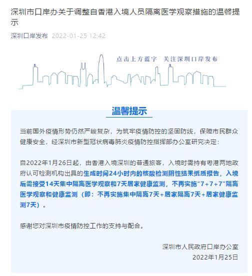 自2022年1月26日起,由香港入境深圳的普通旅客,入境时需持有粤港两地政府认可检测机构出具的生成时间24小时内的核酸检测阴性结果纸质报告,入境后需接受14天集中隔离医学观察和7天居家健康监测,不再实施“7+7+7”隔离医学观察和健康监测(即:不再实施集中隔离7天+居家隔离7天+居家健康监测7天)。