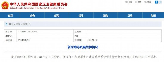 截至2022年1月24日,31个省(自治区、直辖市)和新疆生产建设兵团累计报告接种新冠病毒疫苗297345.9万剂次。