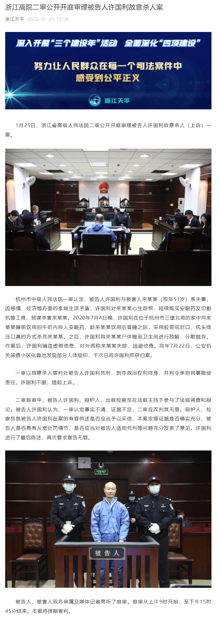 荔枝新闻讯 1月25日,浙江省高级人民法院二审公开开庭审理被告人许国利故意杀人(上诉)一案。