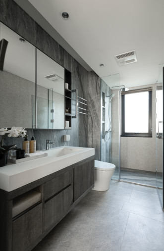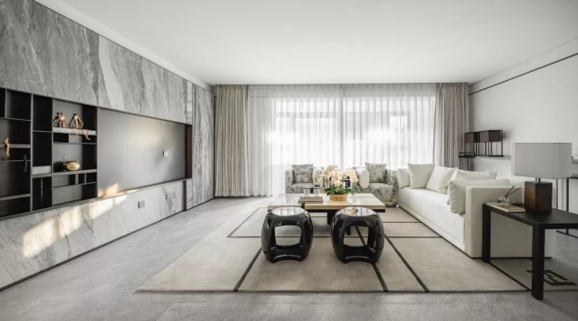 地砖选用铂斯昆仑灰,岩板选用雅博白,皆由公司设计团队与主案总设计师亲寻10余次石材市场选材,几十版拼纹方案比对,工厂多次定制精工扫描,调色打版,与户型空间中的选材色感基调,形成和谐的寒暖对比,内化统一。