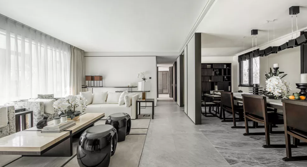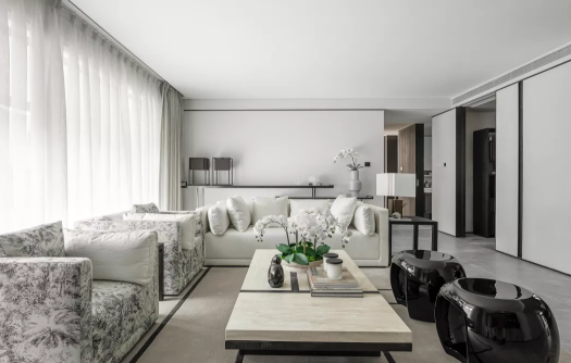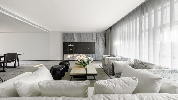 在程绍正韬东方主义美学的空间语境下,淡雅的色调,简洁凝练的线条,融入大横厅、灵感4房的奢适框架之下,