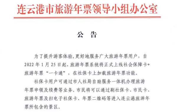 1月25日,连云港市社会保障卡+旅游年票“一卡通”服务将正式上线,实现以社会保障卡为载体的旅游年票“一卡通”功能服务。这就意味着,连云港市将逐步推进社保卡在文旅方面的广泛应用,社保卡用户可通过市人社局自助服务一体机办理旅游年票申领及续费等业务。今后,连云港市民将可以通过刷社保卡、市民卡、旅游年票及扫电子社保卡、年票二维码等进入连云港旅游年票所包含的景区。