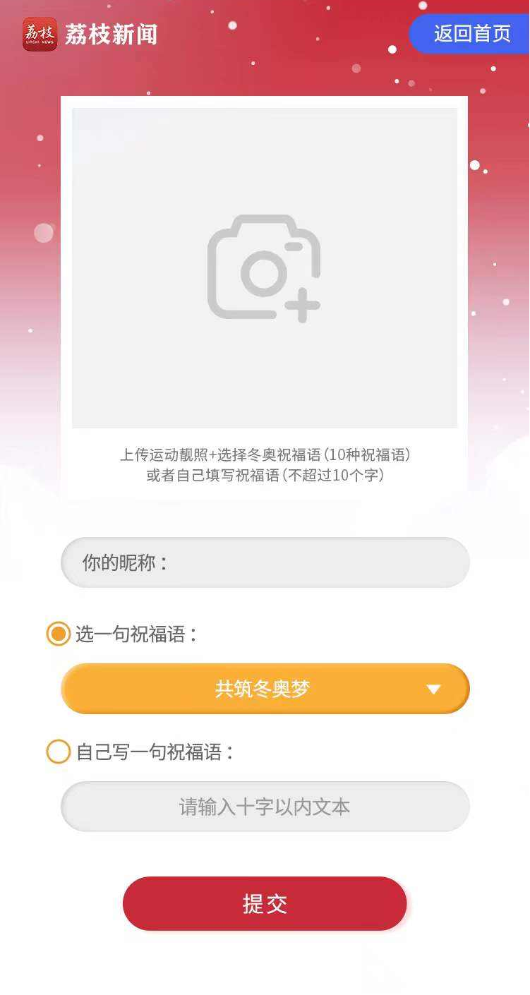 扫描下方海报二维码,进入H5页面,点击“晒靓照”,上传你的照片和昵称并选择祝福语,再点击“提交”,照片经审核后就会出现在我们的运动靓照墙上啦!用运动助力冬奥,以健康恭贺新春,还不来晒?