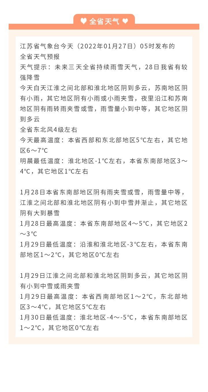 今天白天江淮之间北部和淮北地区阴到多云,苏南地区阴有小雨,其它地区阴有小雨或小雨夹雪,夜里沿江和苏南地区阴有雨转雨夹雪或雪,雨雪量小到中等,其它地区阴到多云,全省东北风4级左右,今天最高温度:本省西部和东北部地区5℃左右,其它地区6~7℃,明晨最低温度:淮北地区-1℃左右,本省东南部地区3~4℃,其它地区1℃左右。