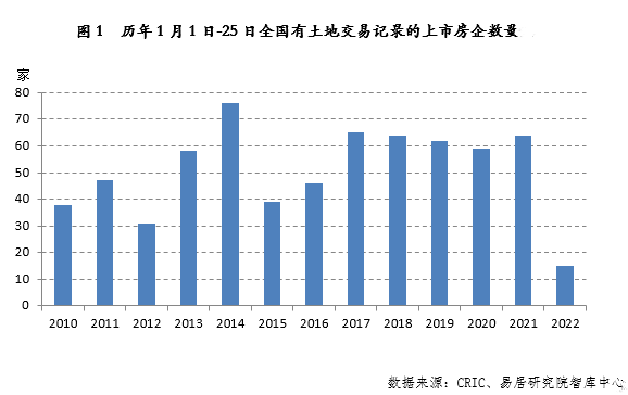 新京报讯(记者 张晓兰)1月26日,易居研究院发布《1月份上市房企拿地排行》报告。其中显示,今年1月1日-25日,全国上市房企拿地积极性总体不高,是自2010年以来同期积极性最低的一次。上市房企中,仅15家房企参与拿地,拿地金额为166亿元。与去年同期全国有64家上市房企参与拿地、拿地金额共计2506亿元相比,今年的拿地房企数量和拿地金额同比下跌77%和93%。