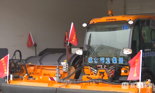 在南京市城市环卫集团,现场可以看到各种扫雪防冻的物资设备已经准备就绪,画面中这台大型除雪机,它一机多能,可以同时实现扫雪、推雪和撒布融雪剂多种功能,一旦上路,可以根据雪情和路况的不同,随时切换不同功能,进行扫雪。南京市城市环卫集团有限公司除雪机械驾驶员赵政利说,多功能一体车每小时可以作业三十公里左右,撒布融雪剂是同步的,一边可以滚雪一边可以撒布。