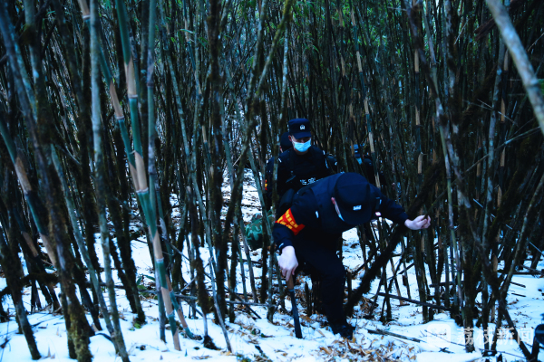 大雪刚过的大娘山腹地,密林丛生,脚下怪石嶙峋,民警沿途行走极其困难,稍不留神就会跌倒。连续下雪,又导致路面湿滑,在经过一段丛林时,只能由一名民警拿着砍刀“开路”,其余队员相互搀扶着前行。