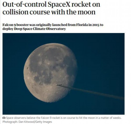 俄罗斯卫星网26日称,根据在线太空垃圾追踪软件的数据,美国太空探索技术公司(SpaceX公司)一枚重达4吨的火箭残骸的太空运动轨迹显示,它即将与月球相撞。“这很可能是第一起太空垃圾撞击月球的意外案例”。
