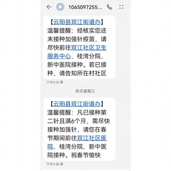 图为广州市民陈先生从未去过重庆云阳县,却多次收到云阳县双江街道办发来的短信。