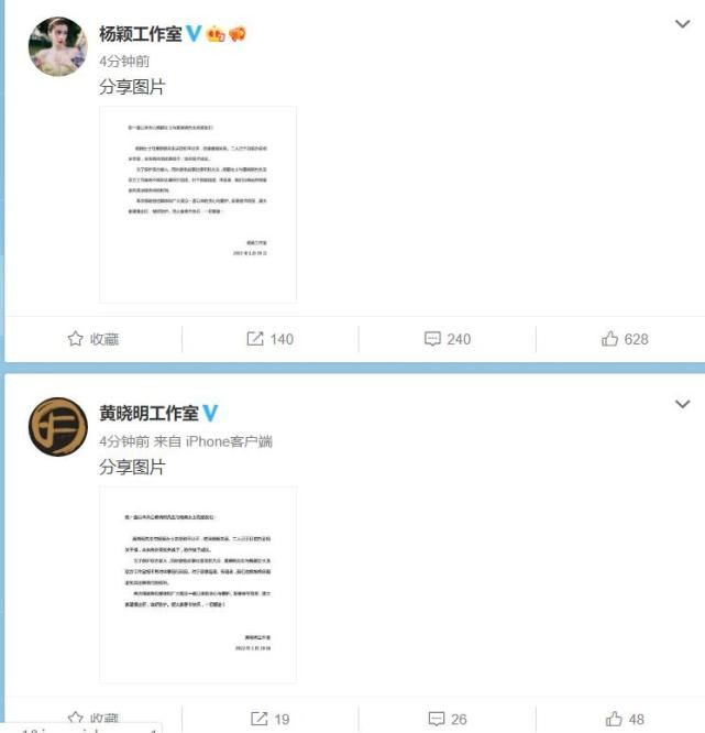 为了保护双方家人,同时避免此事过度叨扰大众,杨颗女士与黄哓明先生及双方工作室将不再对此事另行回应。对于恶意造谣、传谣者,我们也将始终保留追究其法律贵任的权利。