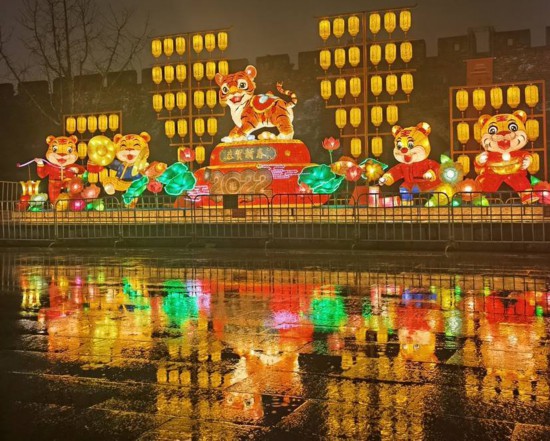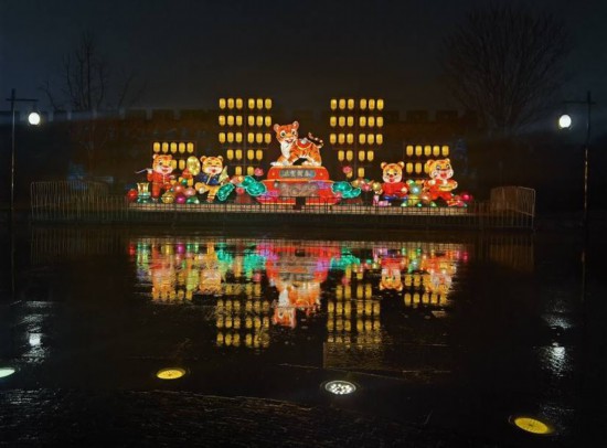 晚上七点,在古胥门城墙西侧,由汪筱文、汪丽秋两位国家级苏灯非遗传承人制作的大型苏州灯彩灯组《虎福临门》熠熠生辉,流金溢彩。威风凛凛的五只卡通小老虎自带调皮的萌态,十分可爱。与它们相伴一起的很多装饰也是充满了节日氛围和江南文化元素。